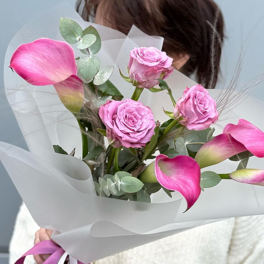 На фото букет «розовый восторг». В составе: калла 4 шт, роза 3 шт, зелень 2 шт, эвкалипт 1 шт, дизайнерская упаковка 1 шт, атласная лента 1 шт, . Все цветы свежие и ароматные, букет красиво оформлен и отлично подходит для подарка. Доступна доставка цветов или самовывоз.