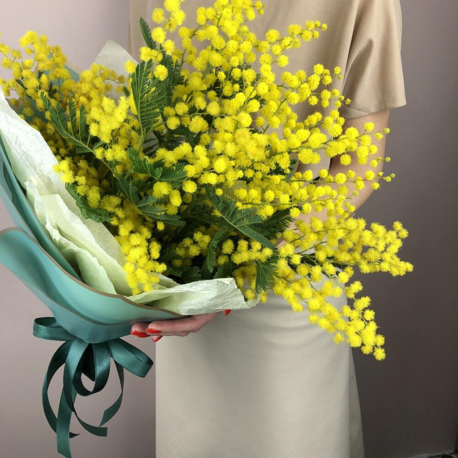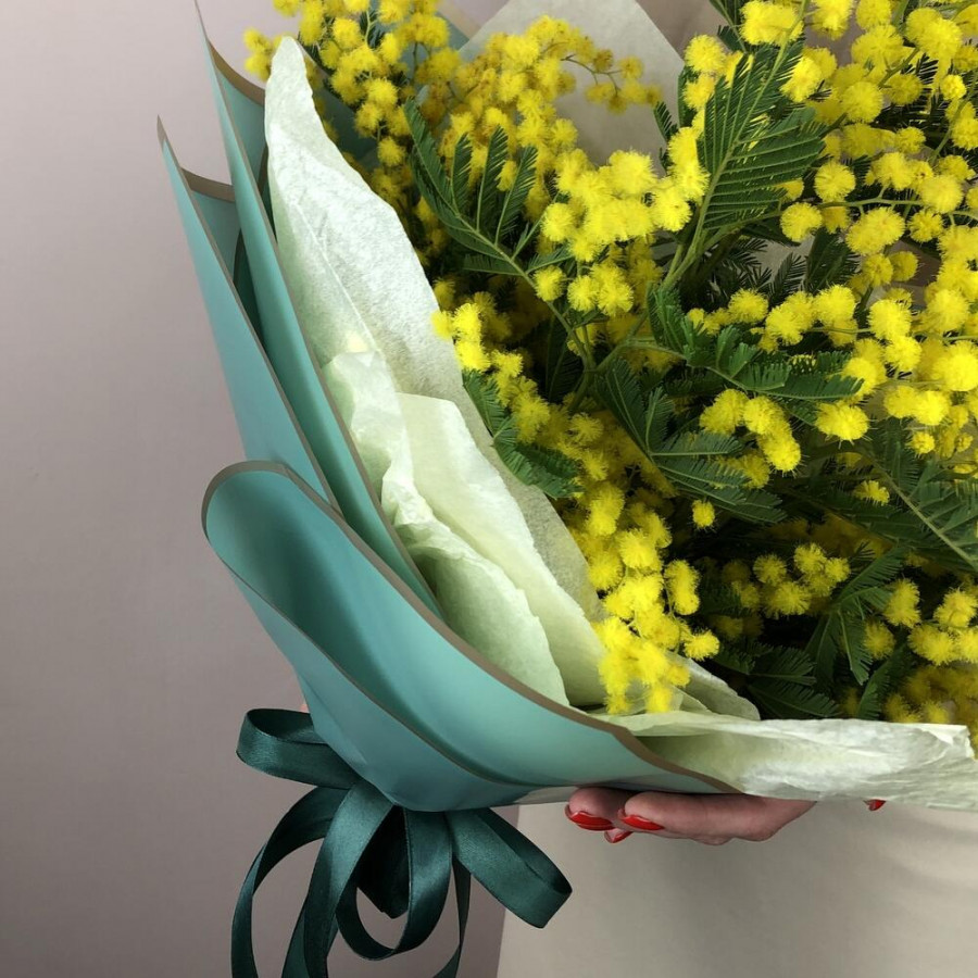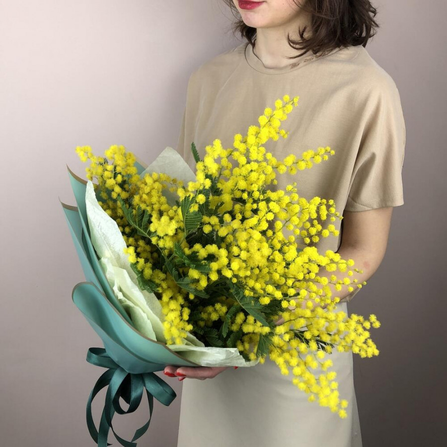 На фото букет жёлтых мимоз. В составе: мимоза 11 шт, дизайнерская упаковка 1 шт, атласная лента 1 шт, . Все цветы свежие и ароматные, букет красиво оформлен и отлично подходит для подарка. Доступна доставка цветов или самовывоз.